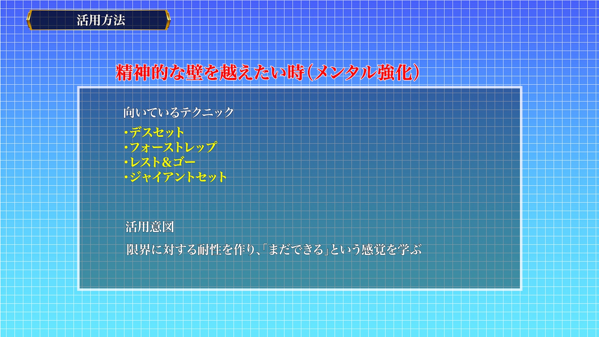 本講座では、ドロップセットやスーパーセットといった筋肥大に直結するテクニックだけ
